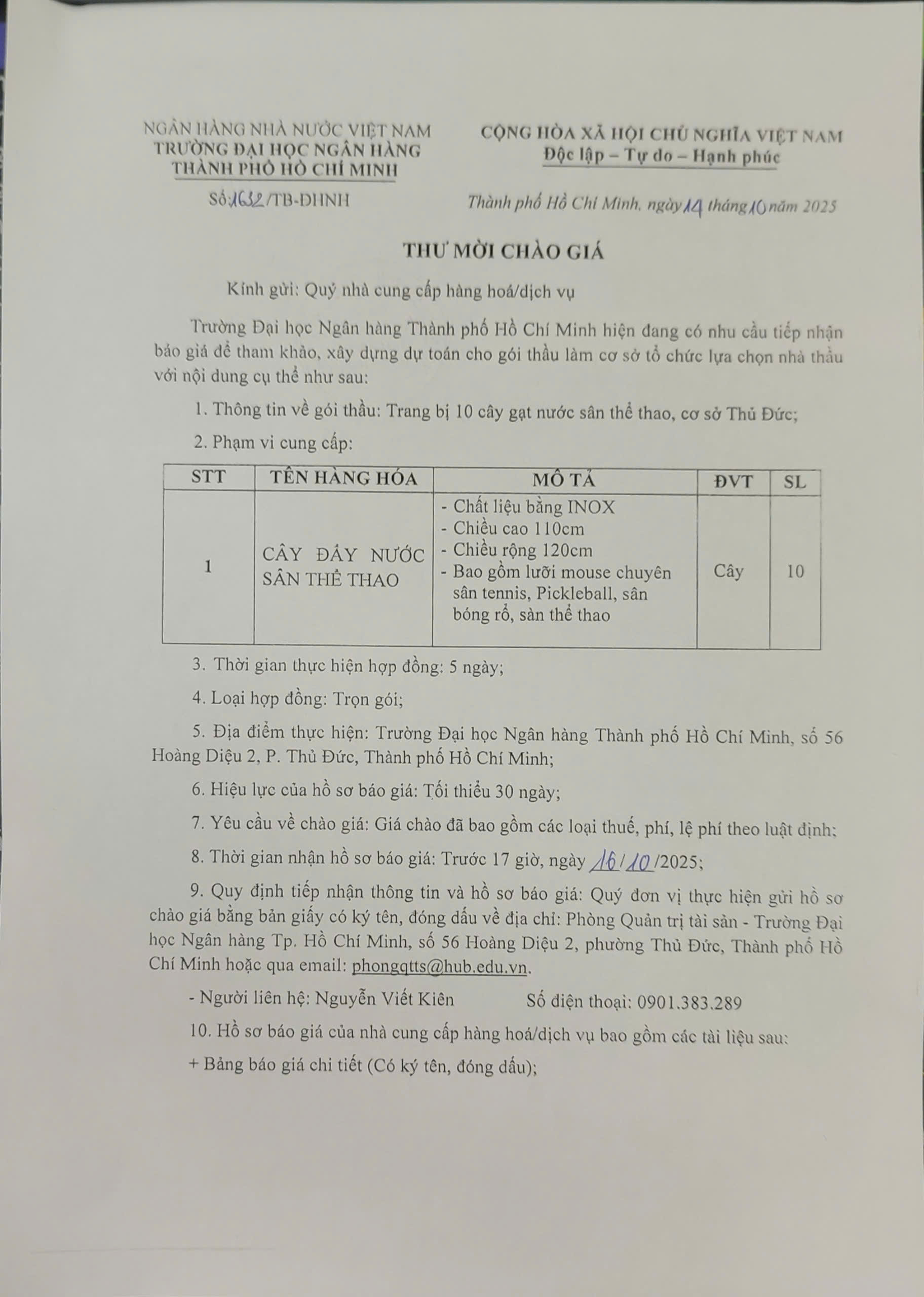 1632/TB -ĐHNH Trang bị 10 cây gạt nước sân thể thao, cơ sở Thủ Đức