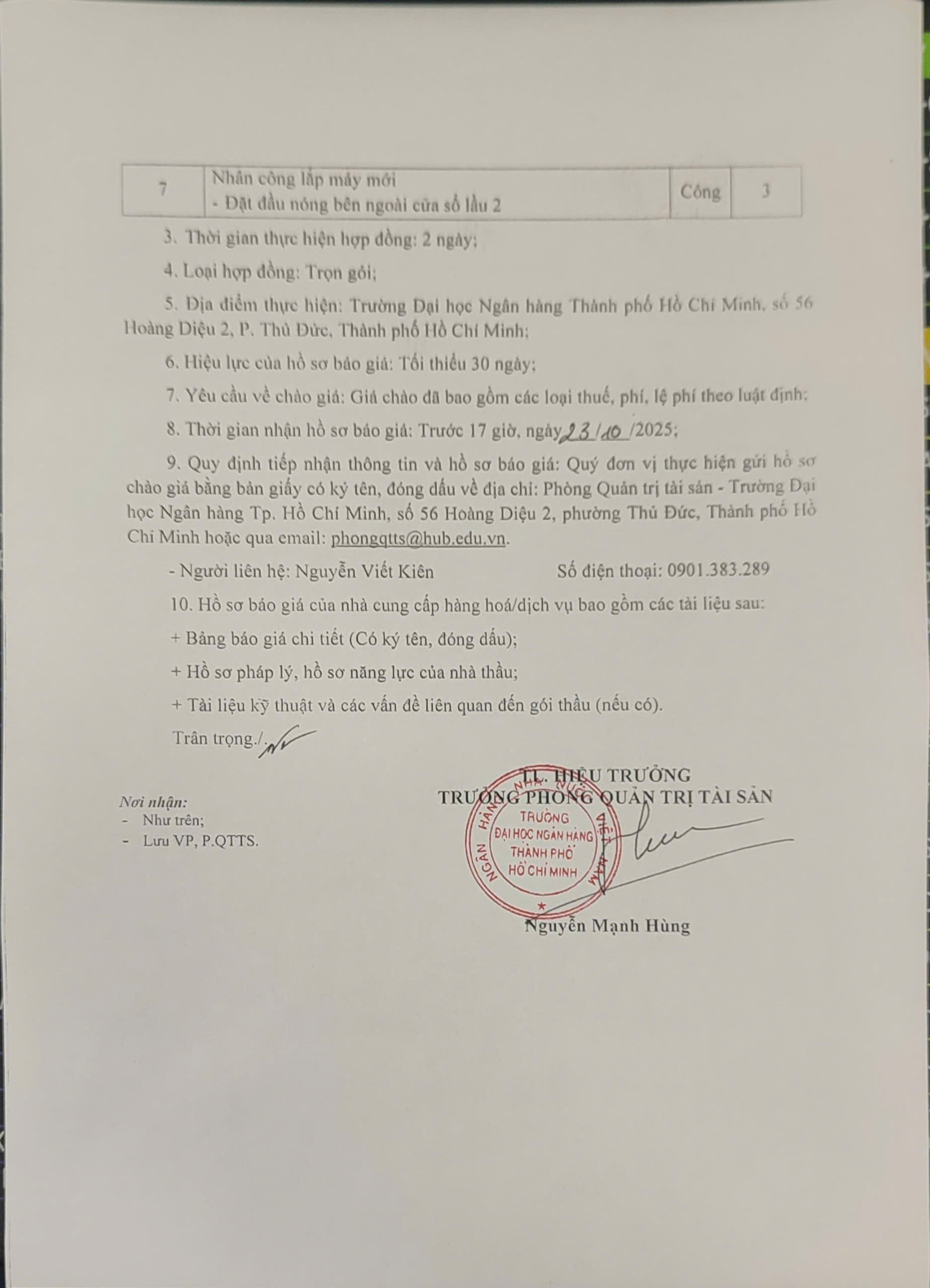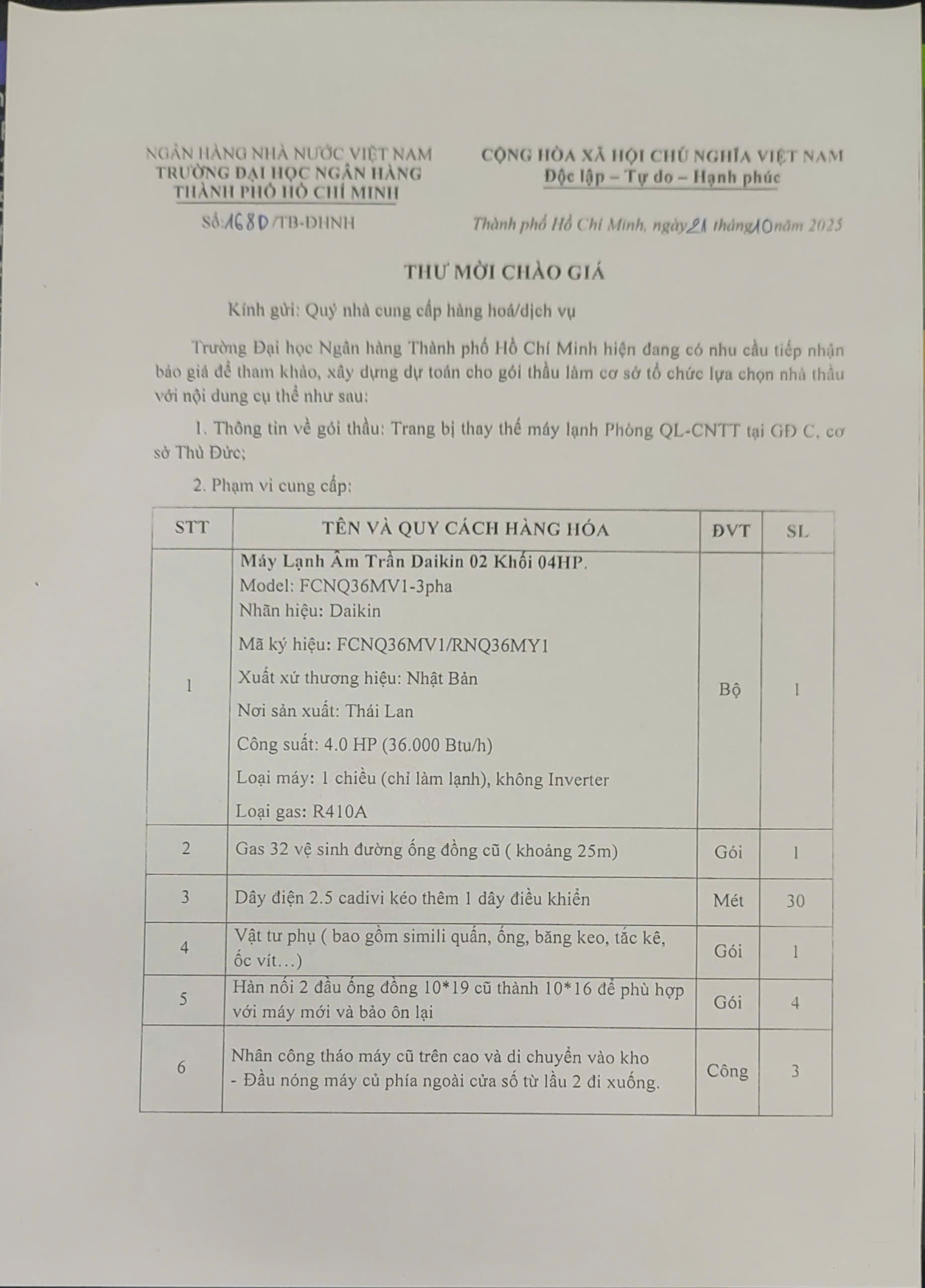 1857/TB/ĐHNH về việc mời chào giá sửa chữa máy lạnh tại Hội trường lớn và phòng học B2.404, khu vực Thủ Đức