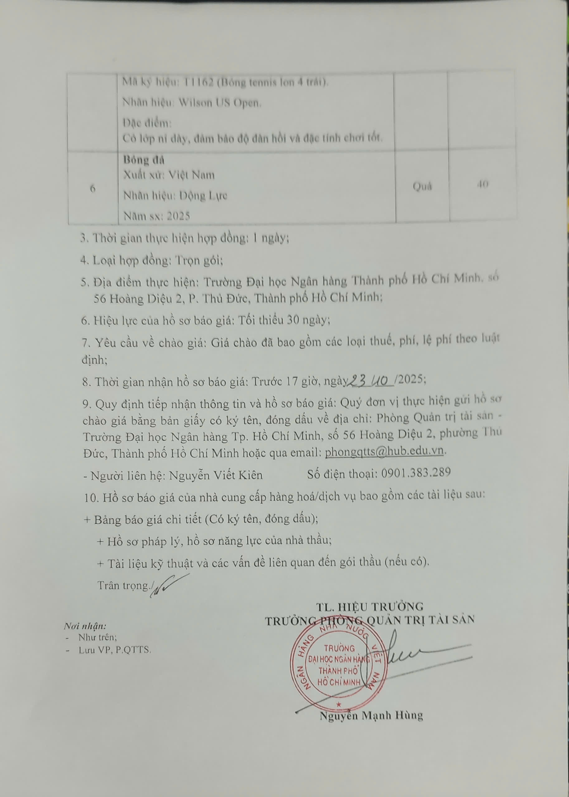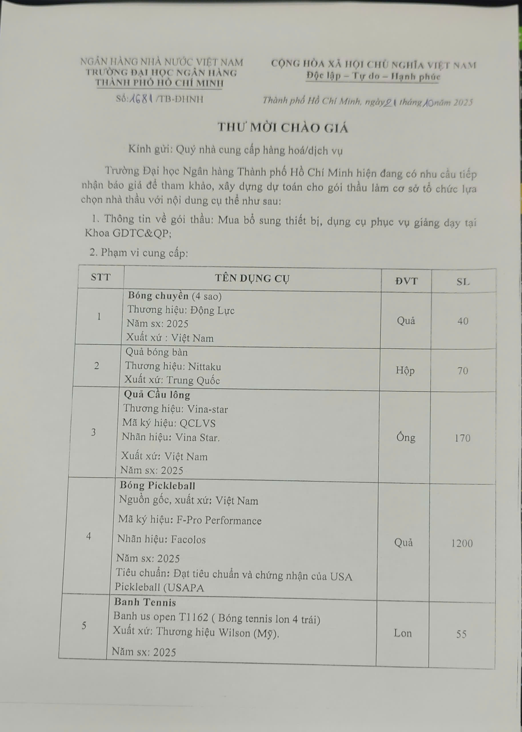 1681/TB-ĐHNH vv Mua bổ sung thiết bị, dụng cụ phục vụ giảng dạy tại Khoa GDTC&QP