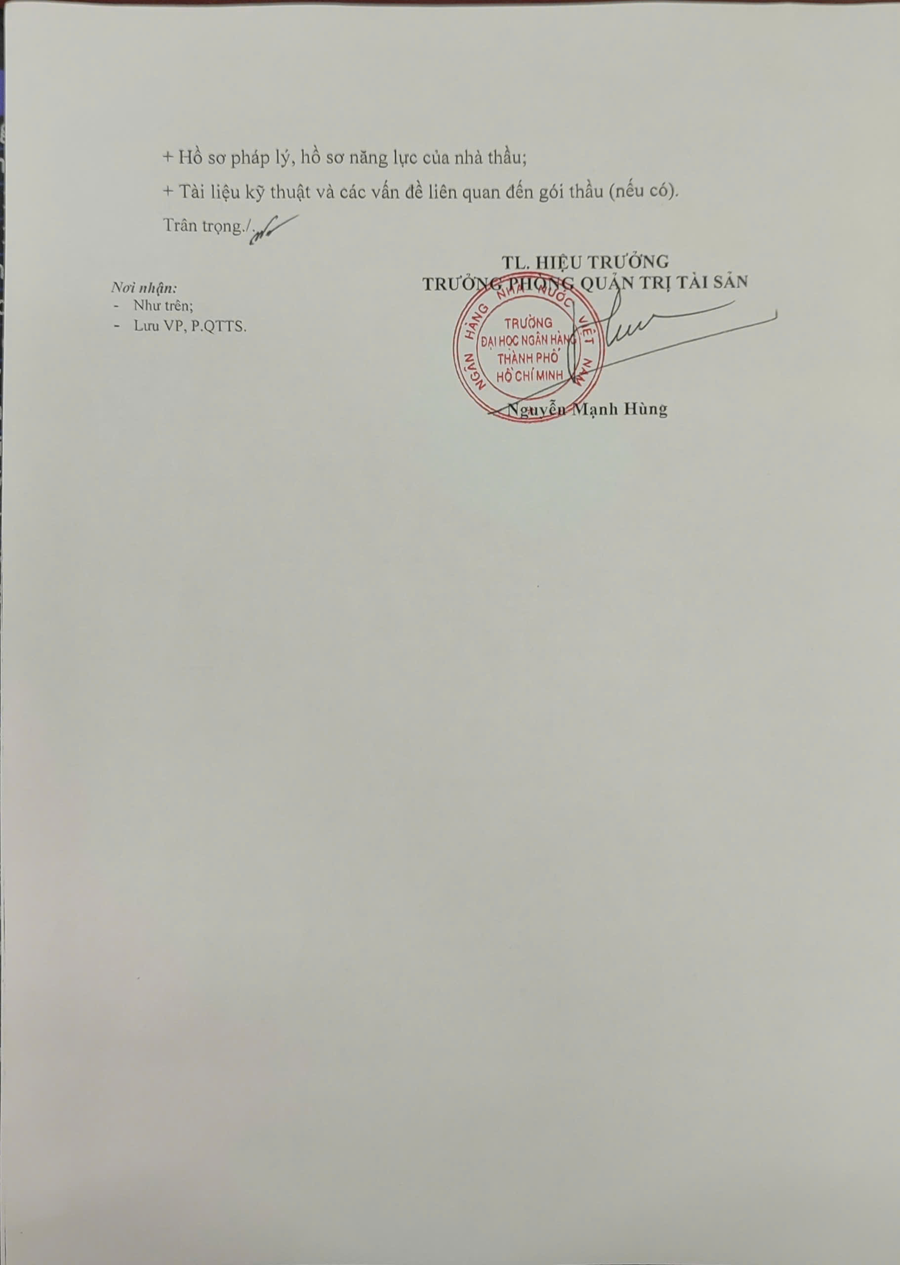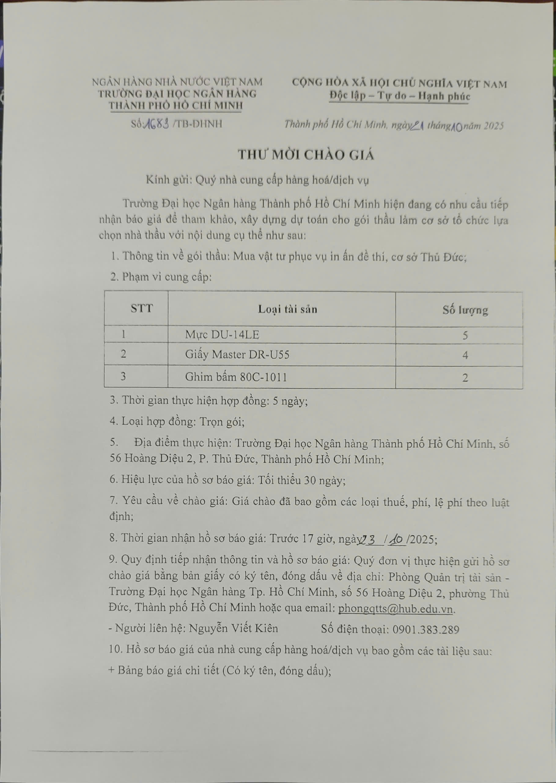 1683/TB-ĐHNH VV CUNG CẤP vật tư phục vụ in ấn đề thi, cơ sở Thủ Đức