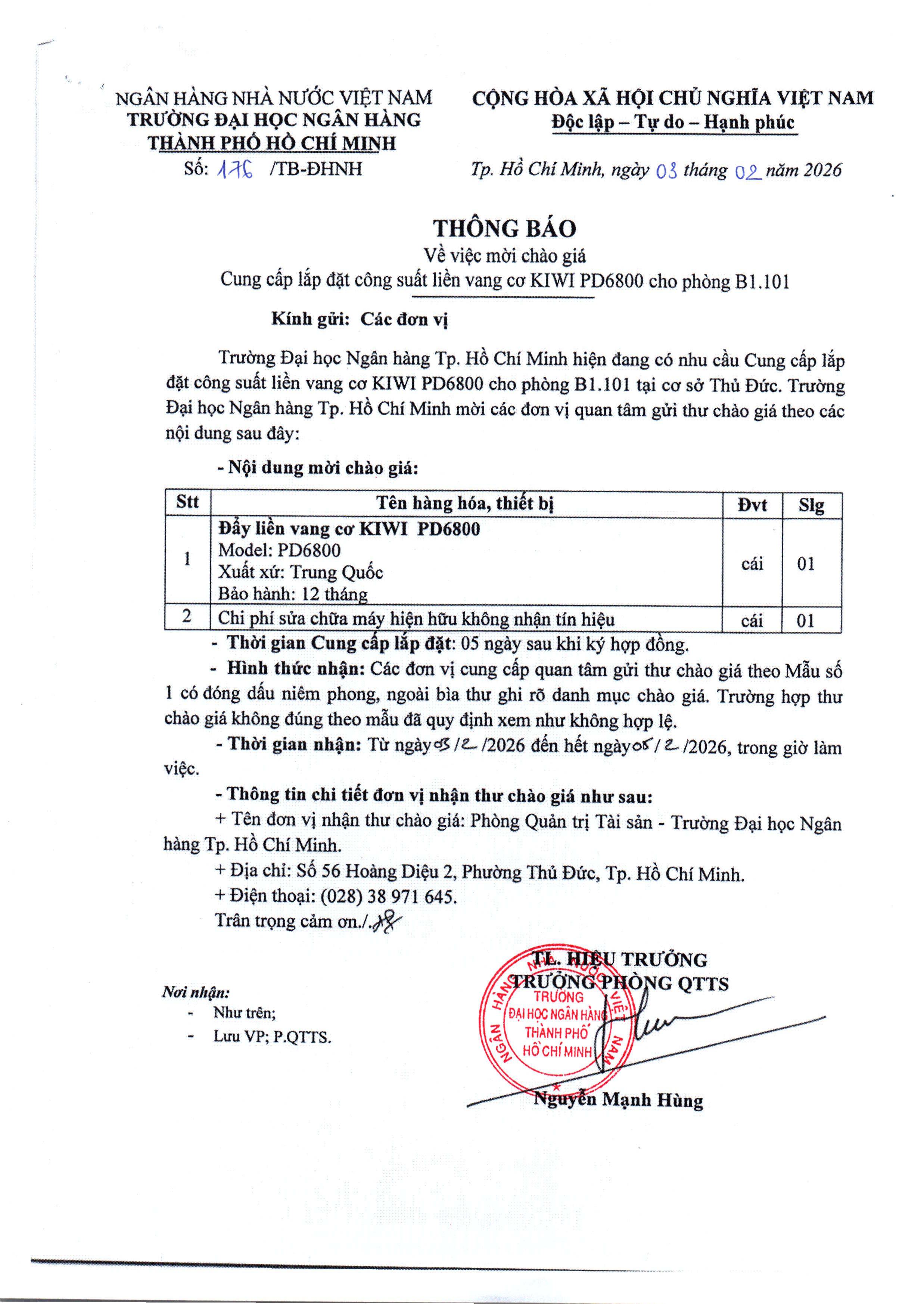 176/TB-ĐHNH Về việc mời chào giá Cung cấp lắp đặt công suất liền vang cơ KIWI PD6800