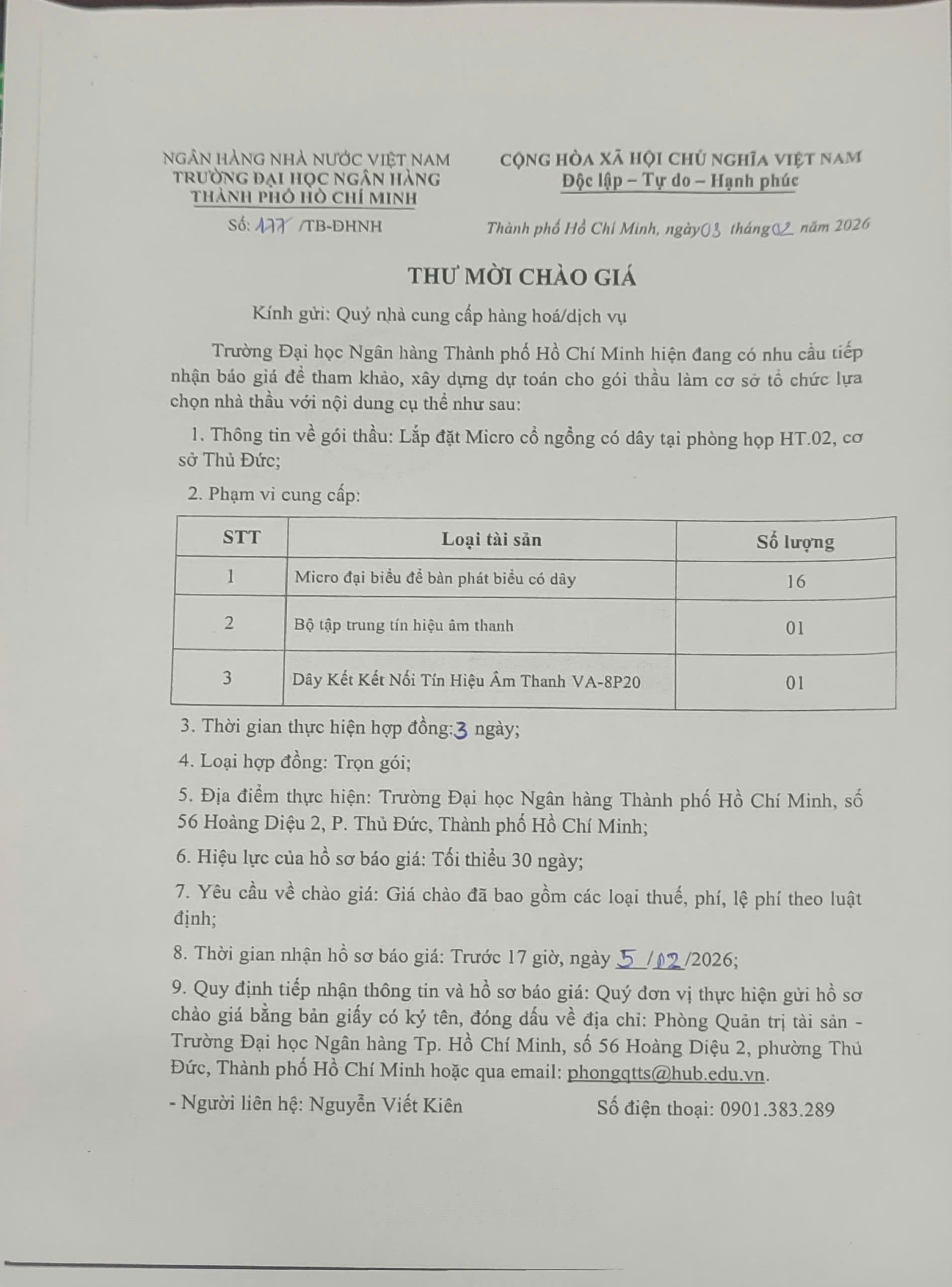 201_Thông báo mời chào cung cấp thiết bị tin học cho các đơn vị cơ sở Quận 1, cơ sở Thủ đức trong quý 1 năm 2026