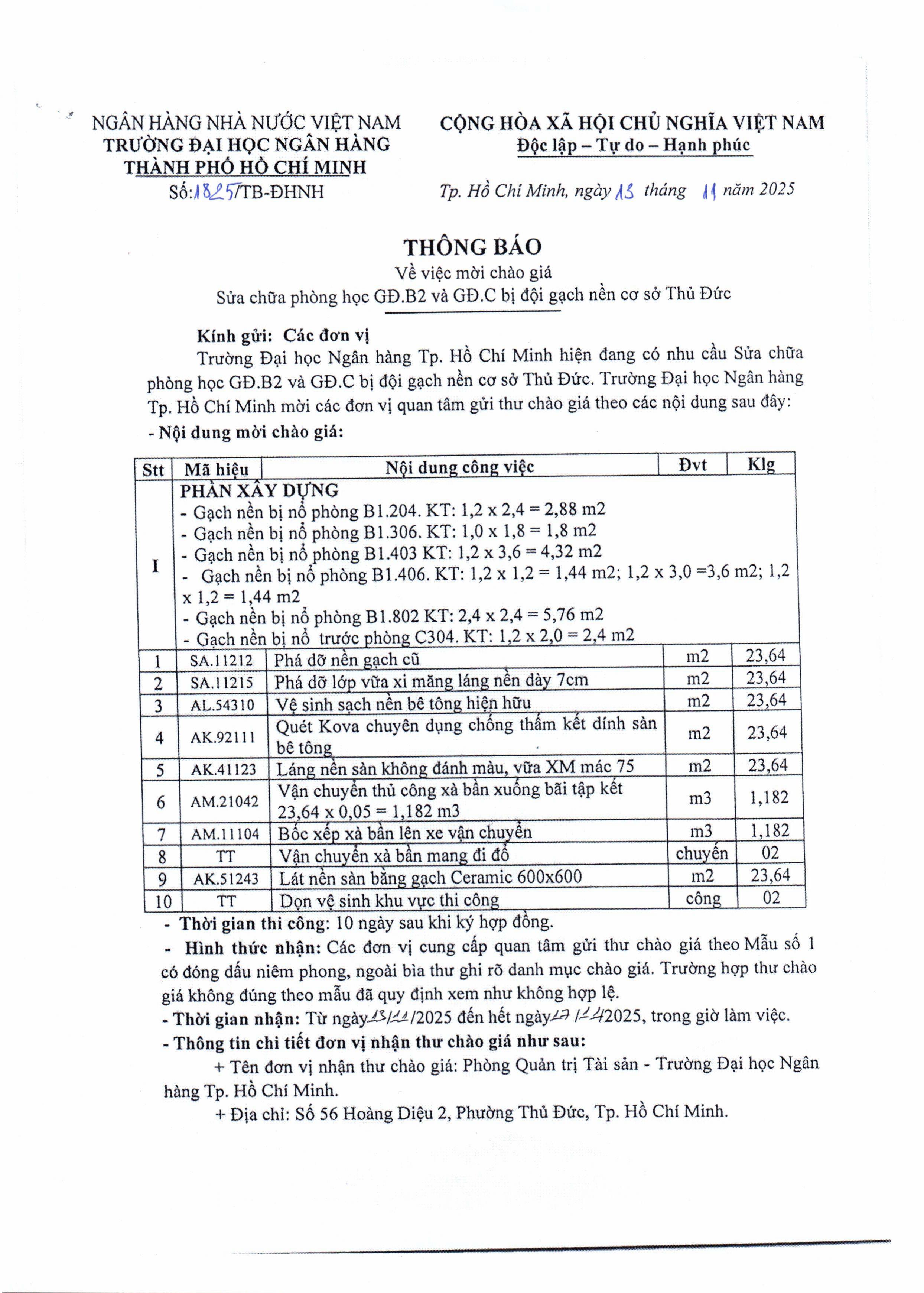 1825/TB-ĐHNH Về việc mời chào giá Sửa chữa phòng học GĐ.B2 và GĐ.C bị đội gạch nền cơ sở Thủ Đức