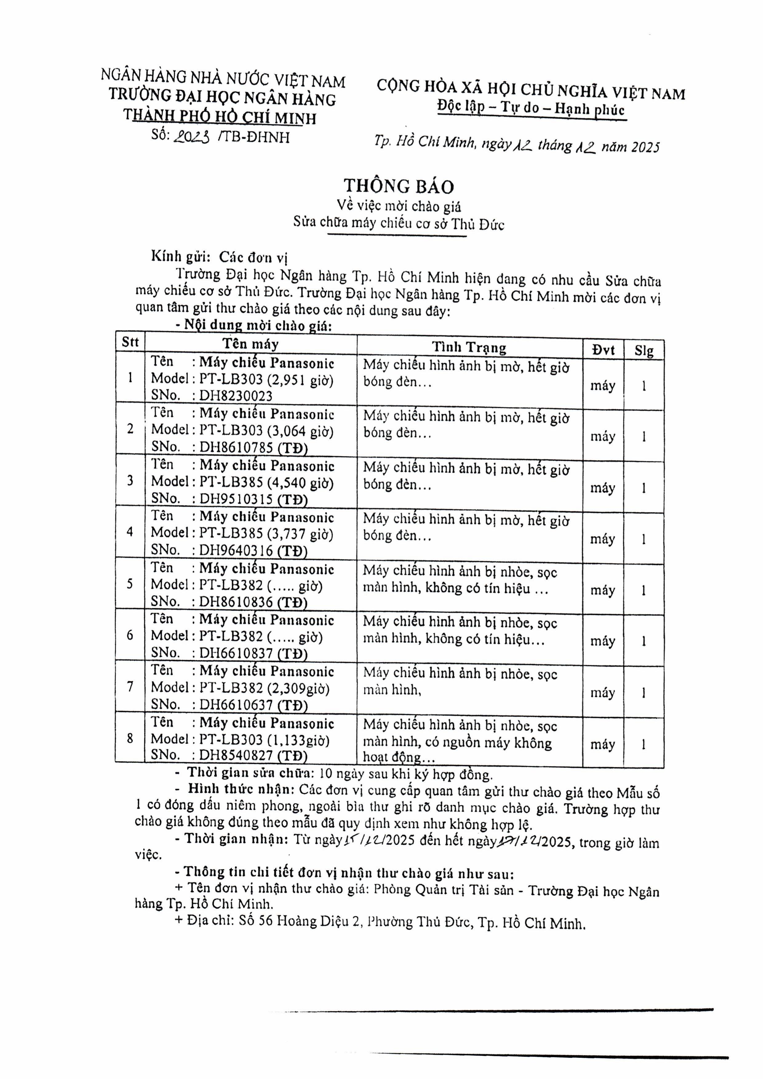 2023/TB-ĐHNH Về việc mời chào giá Sửa chữa máy chiếu cơ sở Thủ Đức