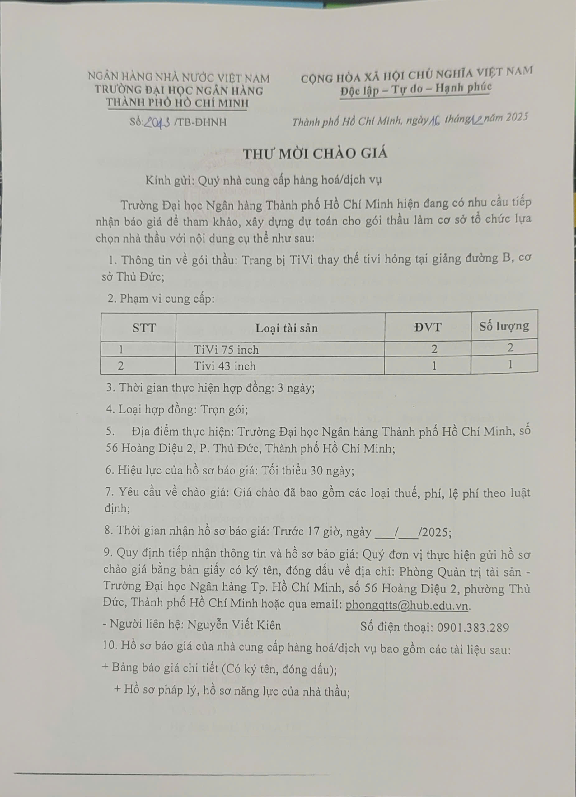 2043/TB-ĐHNH VV CHÀO GIÁ Trang bị TiVi thay thế tivi hỏng tại giảng đường B, cơ sở Thủ Đức