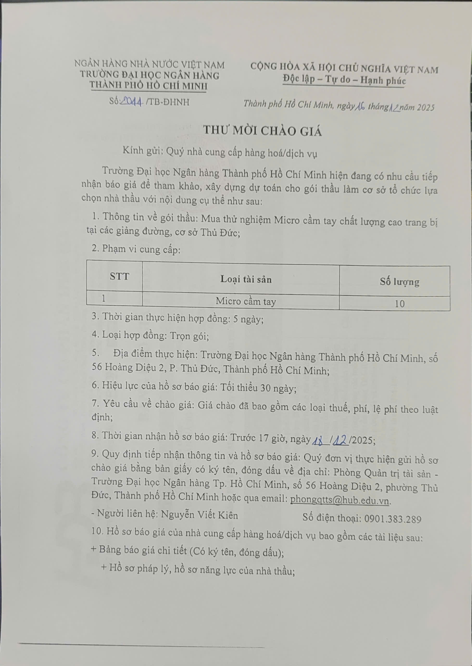 2044/TB-ĐHNH VV CHÀO GIÁ Mua thử nghiệm Micro cầm tay chất lượng cao trang bị tại các giảng đường, cơ sở Thủ Đức