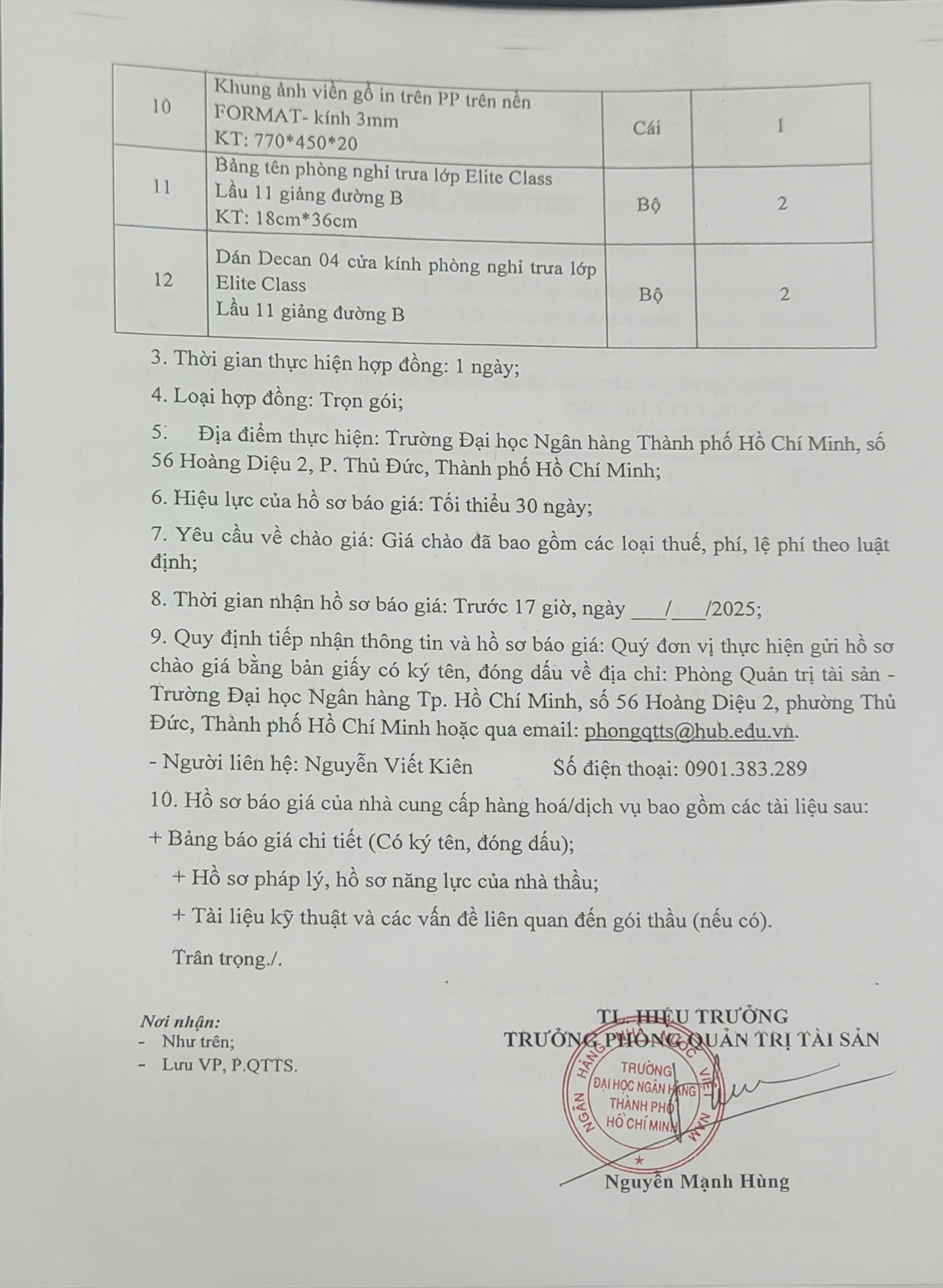 2112/TB/ĐHNH về việc mời chào giá Sửa chữa đèn tại TTTT-TV, bọc thảm đỏ bục tại 2 Hội trường tầng 10 và sửa chữa barie cổng chính, cơ sở Thủ Đức.