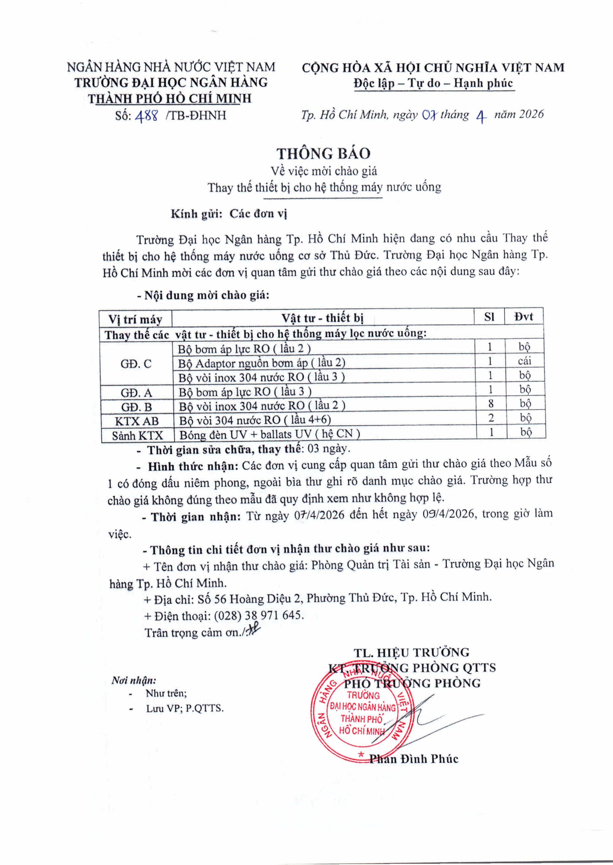 488-Về việc mời chào giá Thay thế thiết bị cho hệ thống máy nước uống